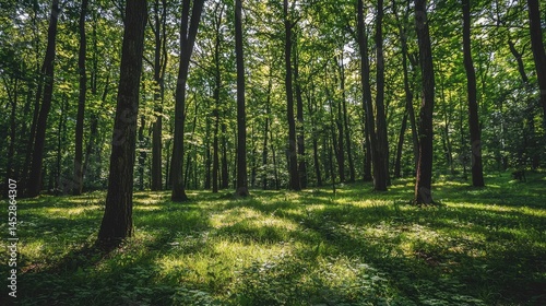 Naklejka premium Lush forest floor bathed in dappled sunlight.