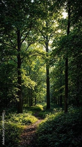 Obraz premium Lush forest floor bathed in dappled sunlight from intricate layers of tree...