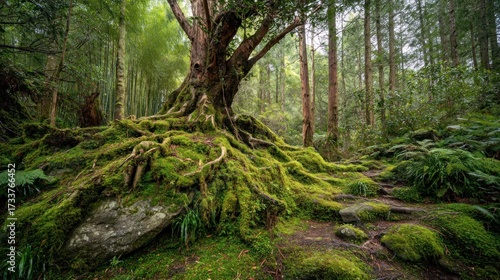 © Mursid, Naklejka premium Lush forest floor with mossy roots