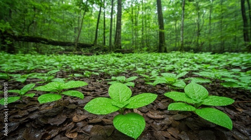 Fototapeta premium Lush forest floor, young plants sprouting, rain, background trees, nature...