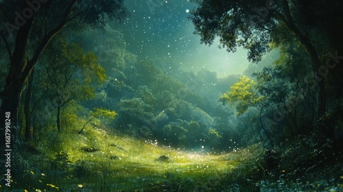 © angga, Obraz premium Lush forest glade bathed in ethereal light