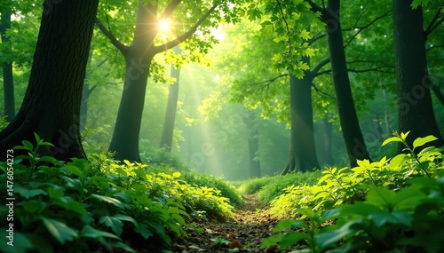 © Kraengkrai, Obraz premium Lush forest green foliage, sunlight dappling through leaves , leaf, forest