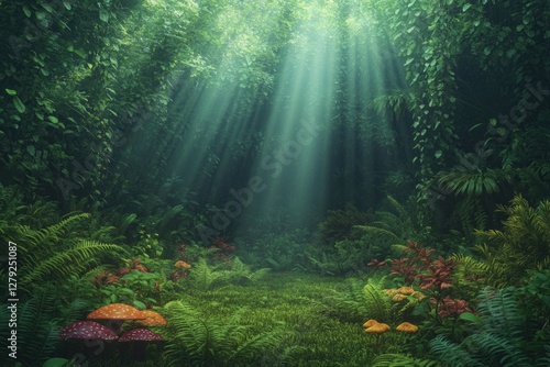 Fototapeta premium Lush forest illuminated by soft rays of sunlight, vibrant flora