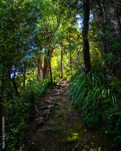 © Jakub, Obraz premium lush forest in otepatotu scenic reserve near akaroa, bank peninsula, canterbury, new zealand south island; park with native plants near christchurch