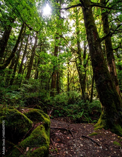 © Tiyur, Obraz premium Lush forest interior with sunlight filtering through