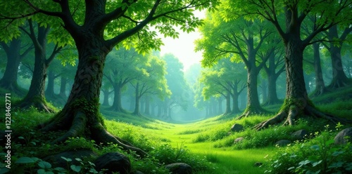 © Kachaphot, Naklejka premium Lush forest landscape with a vast expanse of trees and greenery, forest, scenery