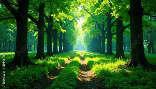 Fototapeta premium lush forest landscape with green foliage and black tree trunks, shadows, trees, forest floor