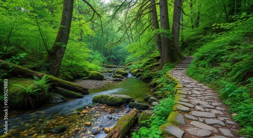 Naklejka premium Lush Forest Landscape with River and Stone Path