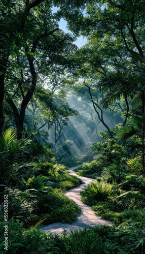 Fototapeta premium Lush forest path bathed in sunlight (1)