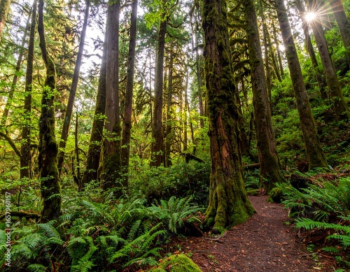 © Nandinics, Fototapeta premium Lush forest path bathed in sunlight