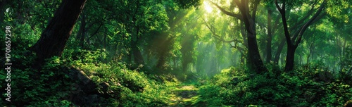 © dinda, Obraz premium Lush forest path bathed in sunlight (1)