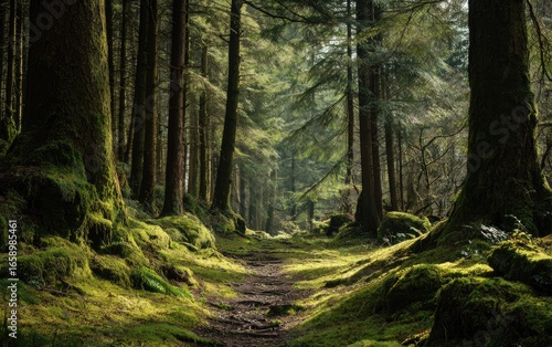 © afdal, Obraz premium Lush forest path in a mossy woodland