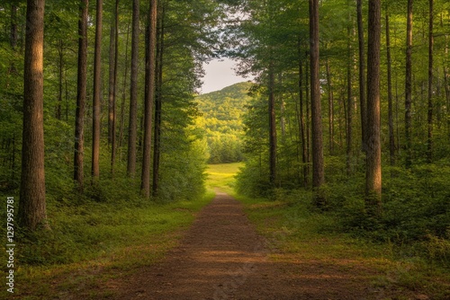 Fototapeta premium Lush forest path leads toward bright clearing, inviting explorat