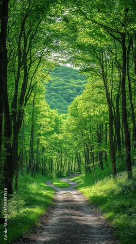 © trahketip, Fototapeta premium Lush forest path. Sunlight through trees