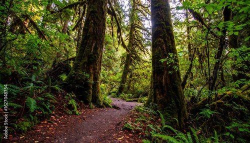 © Silvanacs, Obraz premium Lush forest path through moss-covered trees