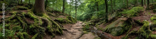 Fototapeta premium Lush forest path winding through mossy rocks and roots
