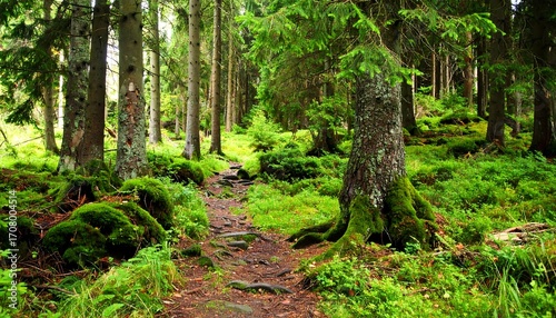 © zenka, Obraz premium Lush forest path winding through mossy woods