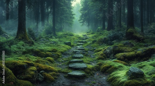 Fototapeta premium Lush forest path with moss-covered stones and ethereal light.