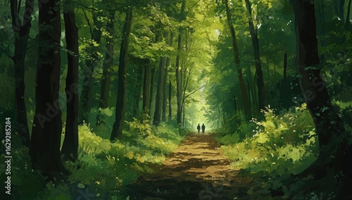 © Hirsa, Fototapeta premium Lush forest path with two figures walking