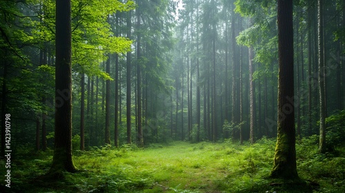 © Alicia, Fototapeta premium Lush forest pathway bathed in soft, misty light.