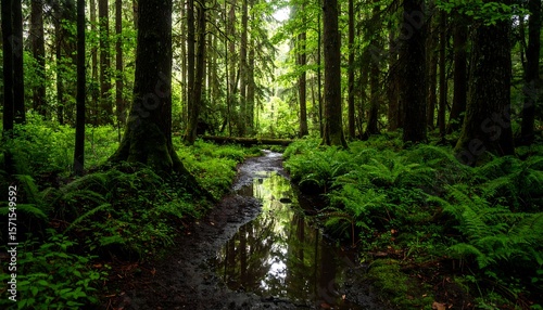 Obraz premium Lush forest pathway reflecting light