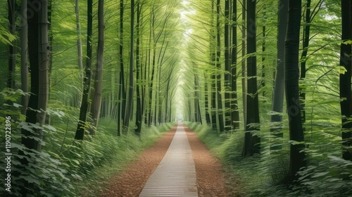 Obraz premium Lush forest pathway surrounded by vibrant green trees, inviting tranquility...