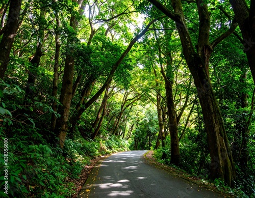 © Udun, Fototapeta premium Lush forest road. Sunlight filters through the canopy