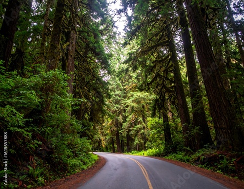 © Ari, Obraz premium Lush forest road winding through tall trees