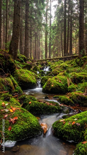 © Avanza, Obraz premium Lush forest scene featuring a flowing stream and mossy rocks
