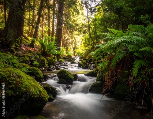 © Tic, Fototapeta premium Lush forest scene featuring a flowing stream and verdant foliage