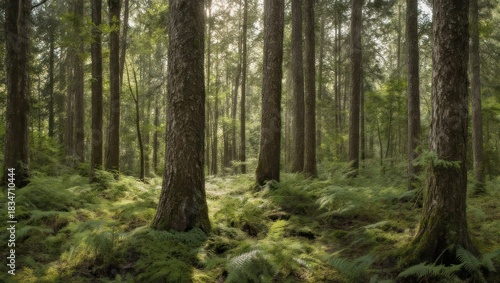Obraz premium Lush Forest Scene - Tall Trees and Green Undergrowth.