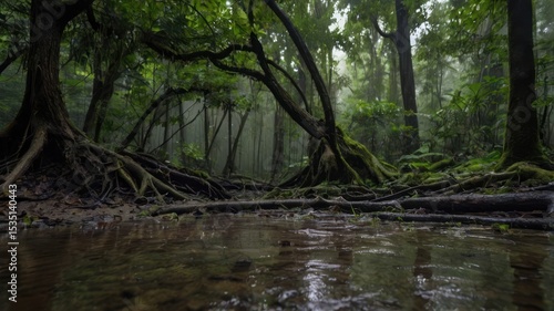© cutecat, Obraz premium Lush forest scene with a flowing stream
