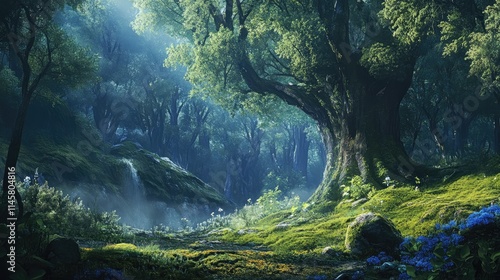 Obraz premium Lush forest scene with ancient trees, vibrant moss, cascading light, and...