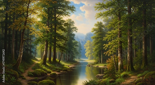 Obraz premium Lush forest scene with river flowing, a calm and tranquil woodland view