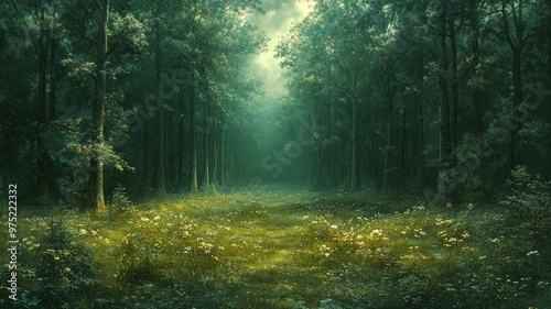 Obraz premium Lush forest scene with soft light illuminating a meadow path.