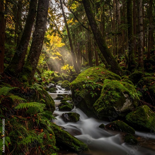 © tukang, Fototapeta premium Lush forest scene with stream, mossy rocks, and sunlight