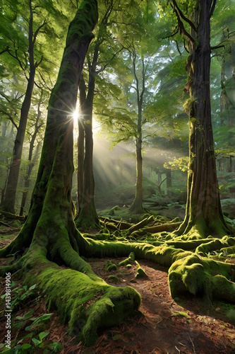 Naklejka premium Lush Forest Scene with Sunlight and Moss