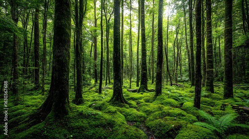 Obraz premium Lush forest scene with tall trees, dense green foliage, a mossy floor, and...