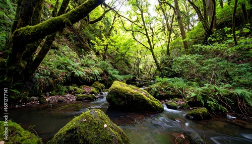 Obraz premium Lush forest stream flowing through mossy rocks