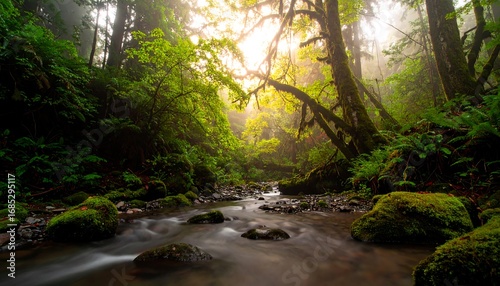 Obraz premium Lush forest stream in morning light