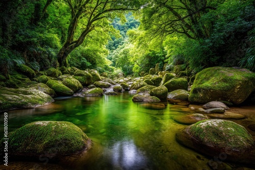 © Sai, Obraz premium Lush forest stream reflecting verdant canopy
