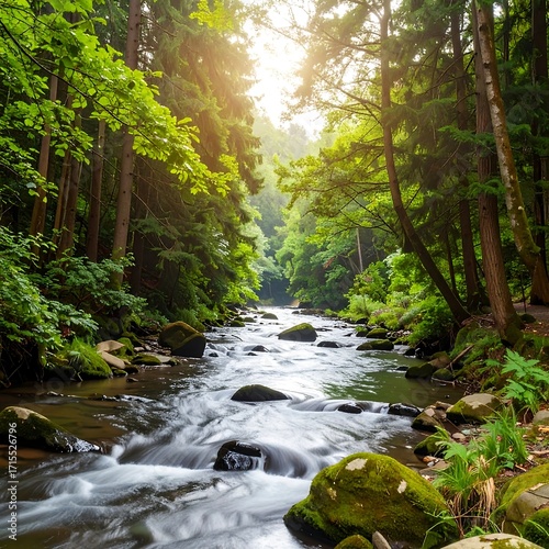 Obraz premium Lush forest stream. Sunlight streams through trees