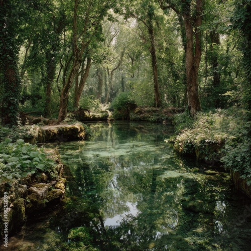 © Celana, Obraz premium Lush forest stream, tranquil reflections