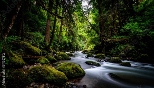 Obraz premium Lush Forest Stream with Mossy Rocks.