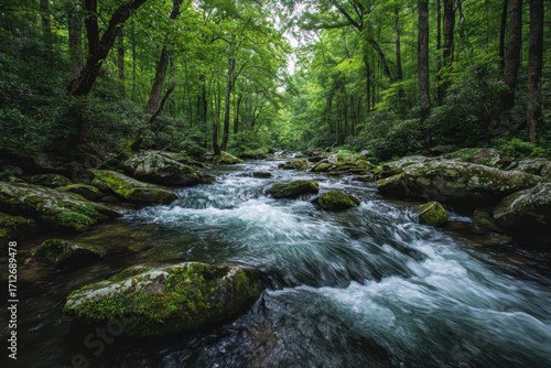 © WarnaNusantara, Fototapeta premium Lush Forest Stream with Mossy Rocks and Flowing Water