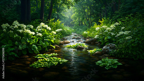 Fototapeta premium Lush Forest Stream with White Wildflowers and Verdant Green Foliage in...