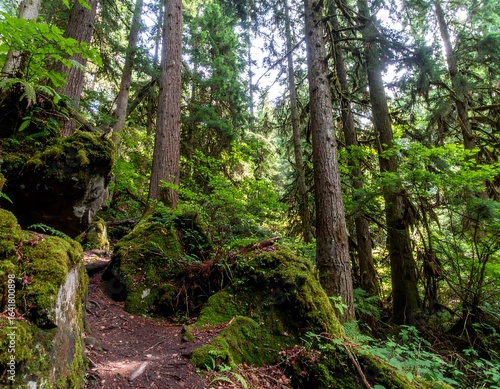 © Akun, Obraz premium Lush forest trail through mossy rocks