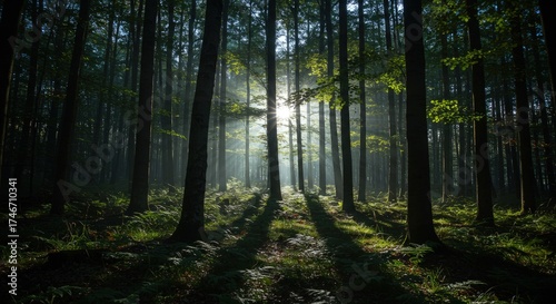 Fototapeta premium Lush forest trees illuminated by sunlight creating a dramatic atmospheric scene