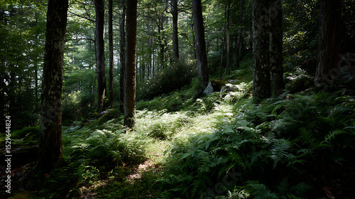 © Kim Ray, Obraz premium Lush Forest Underlayer In Blue Ridge Pine Forest With Rich Ferns And Warm Forest Light
