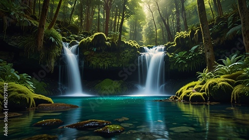 © AI Art Gallery, Fototapeta premium Lush Forest Waterfall and Turquoise Pool in Sunlit Serenity V6